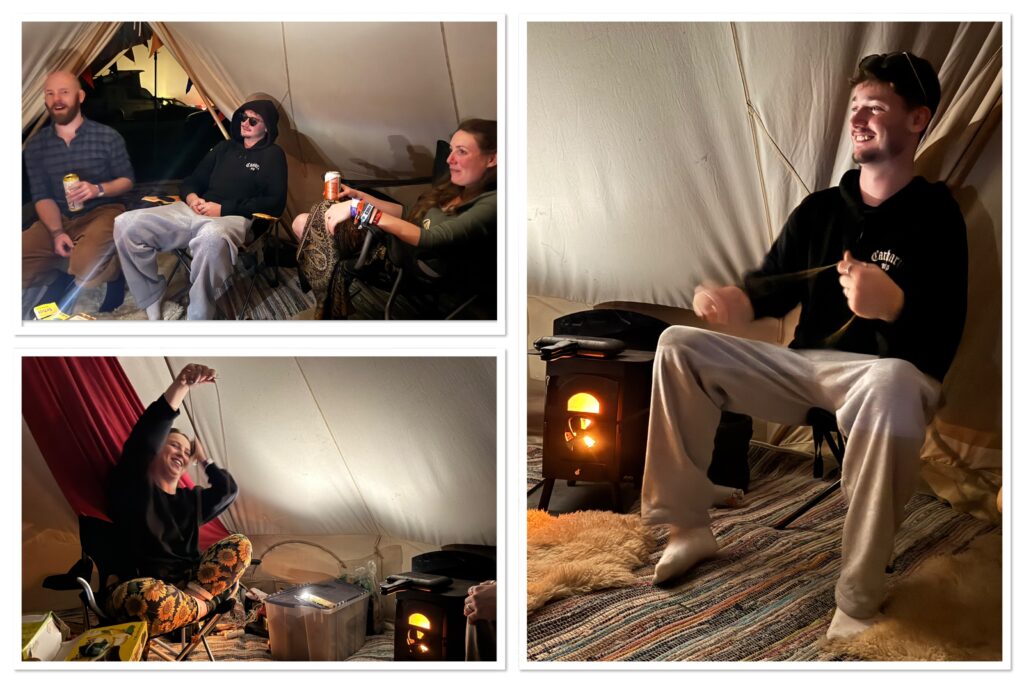 After an evening full of entertainment, we retired to the bell tent, threw a few logs on the burner, cracked open some cans and caught up for hours.